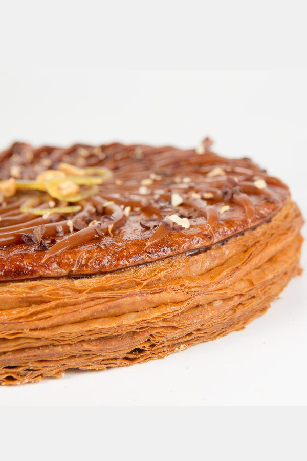 • Composition : La pâte feuilletée inversée cache une crème frangipane à la poudre de noisette grillée et une pure pâte de citron confit de Corse. De délicates opalines caramélisées au miel de callune et des décors en Karamel à tartiner noisette sont déposés sur la pâte feuilletée.