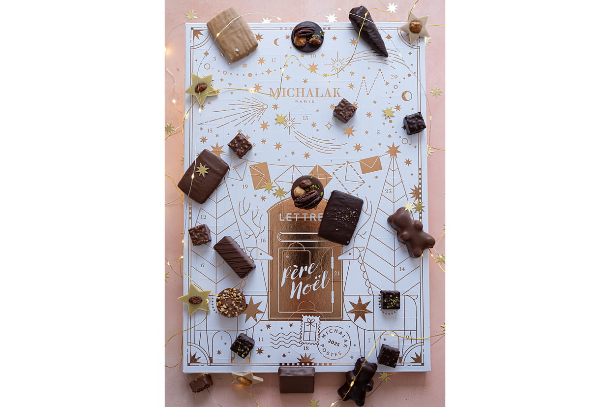 Bonbons pralinés, oursons en guimauve, mendiants, petits sablés et bien d'autres : cette année dans son calendrier de l'Avent, Christophe Michalak propose l'intégralité de sa gamme chocolatée. Un joli calendrier gourmand, élégant et traditionnel.
