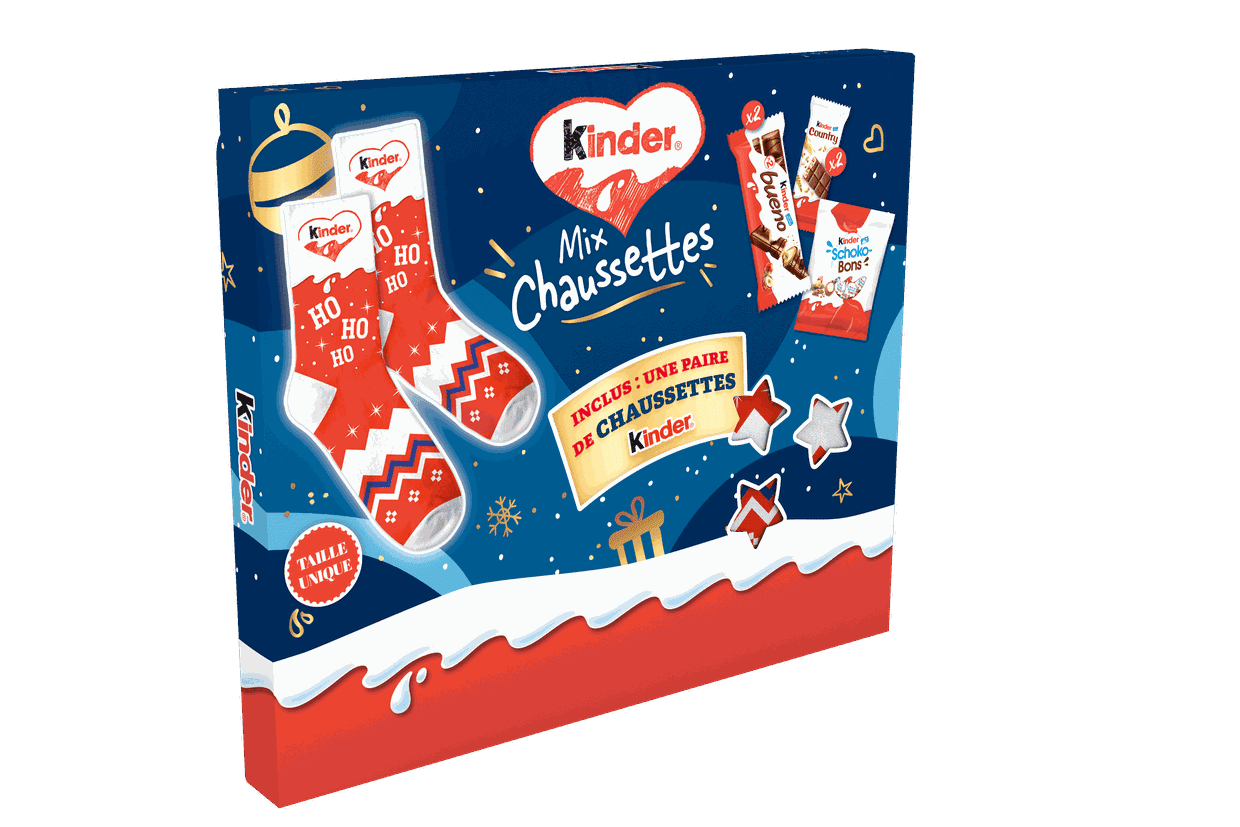 Ce joli coffret fera le bonheur des fans de la marque : une paire de chaussettes Kinder accompagnée d'une sélection des incontournables Kinder Bueno, Kinder Country ou Schoko-Bons… Une bonne idée pour un Secret Santa !