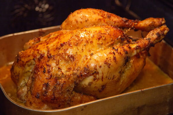 Comme le chapon a une chair plus grasse que la dinde et la pintade, Julie Andrieu lui réserve un traitement particulier. Elle opte pour une farce tout en fraîcheur, afin de ne pas alourdir cette volaille déjà bien dodue. Trois petites pommes à cuire coupées en dés, une belle poignée de cerneaux de noix, du persil haché, assaisonnés d'un demi-verre de calvados, de poivre et de sel, iront donc se loger dans son chapon. La volaille, beurrée sur les flancs, rôtit ensuite au four en deux temps. Après une première cuisson d'1h30 à 150°C, les cuisses vers le haut, Julie retourne le chapon pour une seconde cuisson de 30 minutes, à 210°C cette fois-ci. Mais avant même de commencer à farcir et à rôtir la volaille, l'animatrice passe toujours par une étape, qui change vraiment tout.