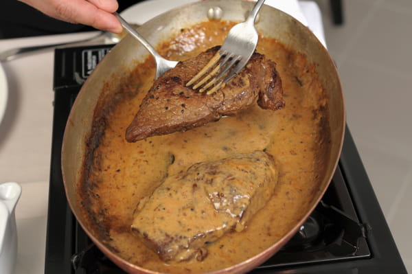 "À l'époque, cette recette était réalisée par les maîtres d'hôtel", explique le chef en vidéo. "Quand ils devaient faire un steak au poivre, ils faisaient la sauce devant les clients". Autant dire qu'il fallait faire vite, pour éviter que la viande ne refroidisse (et que le client, lui, ne s'échauffe !). La star de la recette ? Le poivre bien sûr ! Et pas n'importe lequel : Philippe Etchebest opte ici pour du poivre vert en boîte. Pourquoi ? Ces grains, récoltés avant la pleine maturité, sont plus doux que ceux du poivre noir. Le chef nous met en garde : "Si vous n'avez pas de poivre vert, vous pouvez mettre du poivre noir en grains, mais il faut en mettre vraiment beaucoup moins". La tradition voulait qu'on serve ensuite cette sauce mythique avec de l'entrecôte. Mais pour ceux qui préfèrent les viandes blanches, sachez qu'elle se marie aussi à merveille avec les volailles.