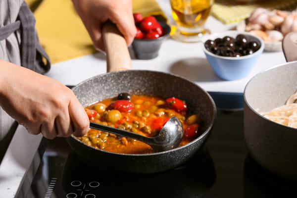 - Pendant ce temps, préparez la sauce : dans une grande sauteuse, chauffez 4 cas d’huile d’olive. Hachez finement les anchois, puis ajoutez l’ail émincé. Faites-les suer quelques instants dans la sauteuse avant d’ajouter les tomates pelées concassées, les câpres et le piment. Ajoutez enfin les olives noires dénoyautées grossièrement coupées. Laissez mijoter à feu vif 6-7 min en remuant de temps en temps.