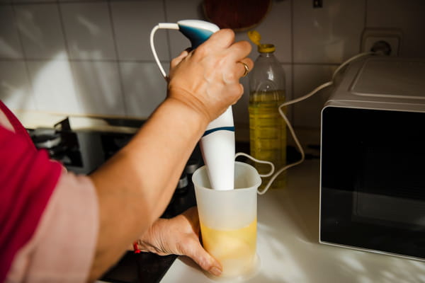 Cette recette astucieuse, on la doit à la grand-mère d'Antoine, qui partage les meilleures idées de sa mamie sur les réseaux sociaux. "Pour faire une mayonnaise légère maison et qui ait un bon goût, j'ai une astuce", promet-elle. Pour préparer cette mayo express, vous aurez besoin d'un verre doseur, d'huile (arachide ou colza), de moutarde, d'un œuf, de sel et de poivre. Côté matériel, il suffit de vous munir… d'un mixeur plongeant. C'est lui qui permettra de monter la mayonnaise en un rien de temps.