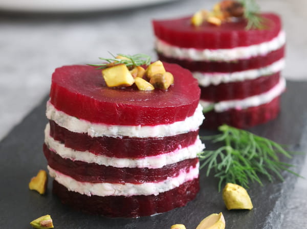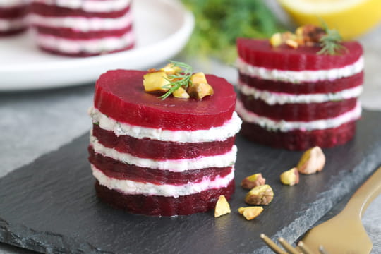 - Réalisez le millefeuille : déposez une première tranche de betterave et tartinez dessus une couche de chèvre de même épaisseur. Répétez l’opération deux ou trois fois selon la hauteur souhaitée, en terminant par une tranche de betterave.