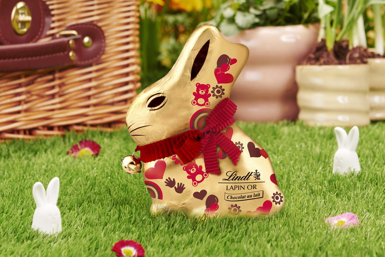 Que serait Pâques sans l'iconique Lapin Or Lindt ? Toujours reconnaissable à son ruban rouge et sa clochette, le Lapin Or Câlin est cette fois-ci décoré d'oursons et de petits cœurs, pour une chasse aux œufs... tout en douceur !
