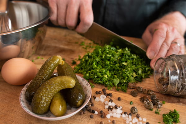 2. Ajoutez ensuite les herbes ciselées, les échalotes émincées ainsi que les câpres et les cornichons concassés. Mélangez à nouveau.