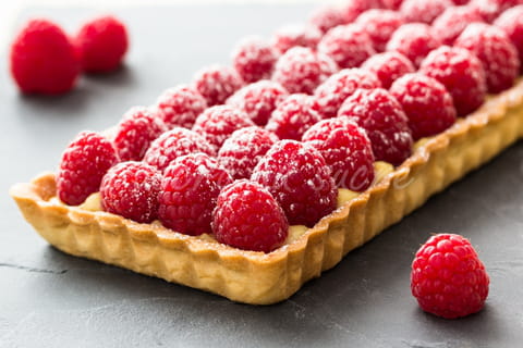 Pour finirLe montage Étaler la pâte, froncer le moule et piquer le fond avec une fourchette. Enfourner pour 30 min environ tout en surveillant la cuisson. La pâte doit être bien dorée. Laisser refroidir avant de démouler. Garnir le fond de tarte de crème pâtissière. Disposer les framboises et saupoudrer de sucre glace.