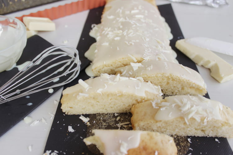 Pour finirDéposer le chocolat blanc dans un récipient. Faire chauffer la crème jusqu’à la première ébullition et la verser sur le chocolat blanc. Fouetter jusqu’à ce que le chocolat blanc soit complètement fondu. Filmer au contact et réserver au frais une dizaine de minutes. Démouler le gâteau et le déposer sur un plat de présentation. Verser la crème sur toute la longueur du gâteau.