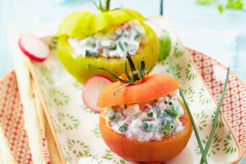 - 4 Taillez les radis en petits cubes. Mélangez les morceaux de haricots verts et de radis avec la crème de Saint Môret® puis farcissez les tomates préalablement assaisonnées de sel et poivre.
