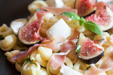 Pour finirDans un saladier, mélanger les pâtes avec un beau filet d’huile d’olive, saler et poivrer. Répartir les pâtes refroidies dans quatre assiettes. Disposer ensuite la mozzarella, le jambon, et les figues. Finir par les copeaux de parmesan et le basilic.