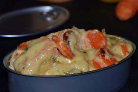 - 1 Commencer par faire cuire les carottes coupées dans de l'eau pendant environ 20 minutes puis égoutter. Faire fondre 20 g de beurre puis faire revenir les blancs de poireaux, ajouter les carottes et le saumon coupés en morceaux puis laisser reposer 5 minutes.
