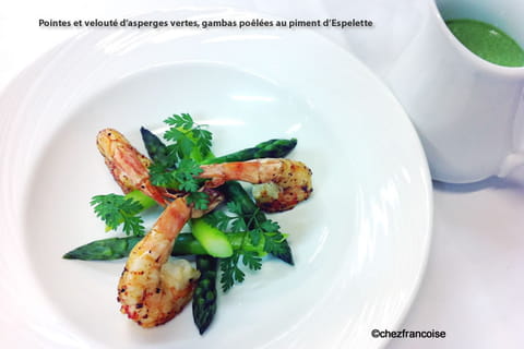 Pointes et velouté d'asperges vertes, gambas poêlées au piment d'Espelette