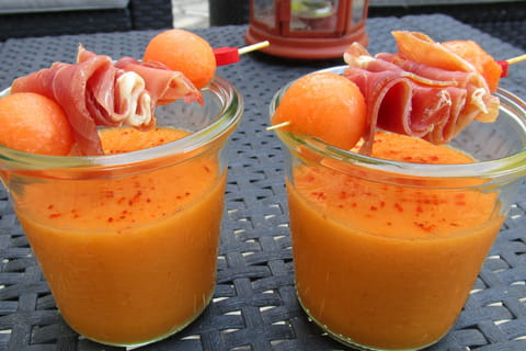 Pour finirMettre sur un pic ne bille de melon, la tranche de jambon Serrano pliée en accordéon puis l’autre bille. Poser sur le ramequin. Mettre au moins 1 heure au frais avant de servir.