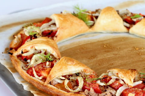 Sortez la pâte feuilletée du réfrigérateur. À l'aide d'un couteau pointu ou d'une roulette à pizza, réalisez 4 incisions au centre de la pâte de manière à obtenir une croix à 8 branches. Soulevez les pointes délicatement et assurez-vous que la pâte a bien été découpée. Ainsi vous ne rencontrerez pas de problème lorsque la garniture aura été déposée et qu'il faudra former la couronne. Replacez-les. - 4 Garnissez ensuite l'extrémité de la pâte avec, dans l'ordre, la sauce tomate, le thon émietté, les dés de tomate et les rondelles de fenouil. Terminez en saupoudrant l'ensemble de la pâte de parmesan. Repliez les pointes sur la garniture de manière à former une couronne. Appuyez légèrement la pointe sur la pâte afin de souder le tout.