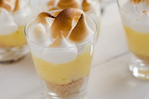 - 4 Montage : Dans des verrines, déposer un petit centimètre de biscuit moulu, puis une couche généreuse (2 à 2,5 cm) de crème citron. Poser la meringue à la poche à douille. Dorer la meringue au chalumeau.