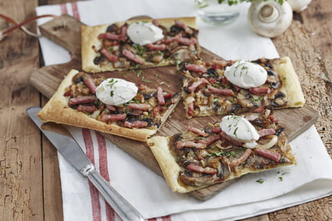 - 3 Répartissez les champignons sur les rectangles de pâte, ajoutez le mélange allumettes-oignons et faites cuire 20 minutes dans le bas de votre four.