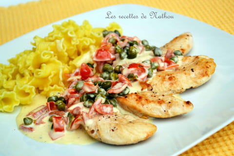 Aiguillettes de poulet, sauce crémeuse aux tomates cerise et aux câpres
