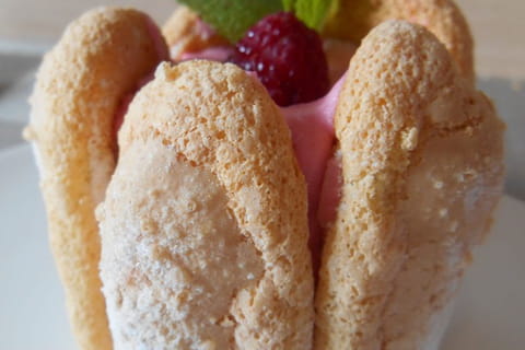 Pour finirCouper les extrémités des biscuits à la cuillère.Tapisser le pourtour et le fond des emporte-pièces avec les biscuits (vous pouvez les imbiber légèrement avec du sirop de framboise dilué dans un peu d'eau). Verser la mousse aux framboises à l'intérieur. Placer au frais au minimum 4 heures et démouler juste avant de servir.