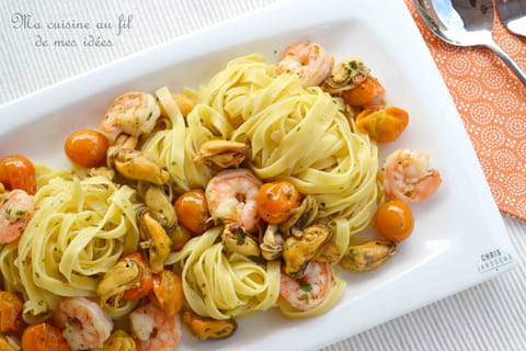 Tagliatelle aux moules, crevettes et tomates cerise poêlées à l'ail