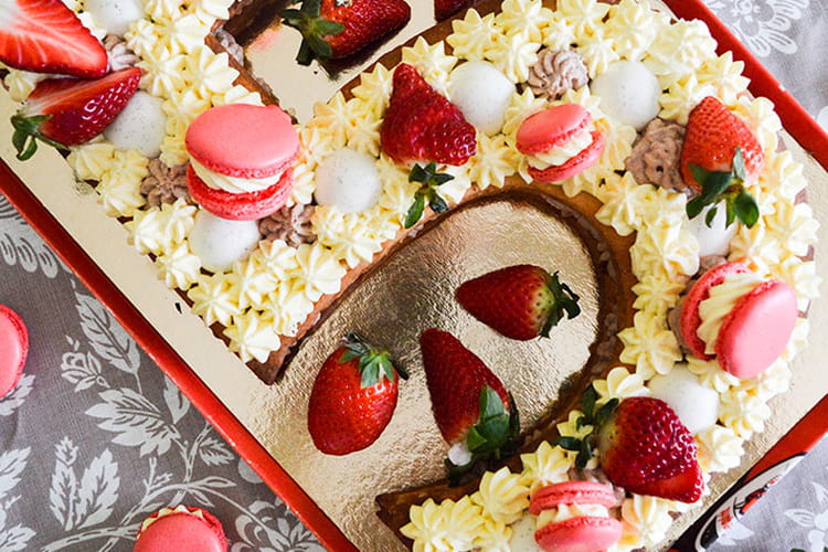 Pour finirLe montage 1. Placez votre lettre/chiffre en pâte sablée sur votre plat de service. Ici, j’ai placé un carton doré dans un grand plateau, vu la dimension de ma lettre, c’était ma seule option. Collez votre lettre/chiffre sur votre carton doré à l’aide d’un peu de mousse, ainsi, cela évitera que le gâteau glisse sur le carton, surtout si vous devez le transporter. 2. Démoulez les pannacotta et placez les grandes demi sphères sur votre chiffre/lettre. Pochez sur tous les bords et tout autour des dômes de pannacotta la mousse de fraise. Soyez généreux, normalement il ne doit pas en rester ou presque pas. Soignez le pochage de la mousse car c’est elle que l’on verra sur chaque bord du letter/number cake. 3. Recouvrez de la 2ème lettre/chiffre en pâte sablée. Placez les petites demi sphères de panncaotta sur votre chiffre/lettre de façon harmonieuse. Pochez tout autour la mousse mascarpone et soignez le pochage pour un bel effet. Il vous restera de la mousse 4. Garnissez quelques macarons de cette mousse mascarpone. Placez les de façon esthétiques sur le dessus de votre gâteau. 5. Ajoutez quelques fraises fraîches et éventuellement quelques feuilles de menthes (je voulais le faire mais la menthe de mon jardin n’était pas assez jolie). Laissez libre cour à votre créativité, vous pouvez rajouter du chocolat râpée, des fleurs comestibles… 6. Réservez au réfrigérateur jusqu’à dégustation. Attention, la pâte sablée va vite ramollir, il faut donc déguster le gâteau quelques heures après l’avoir réalisé.