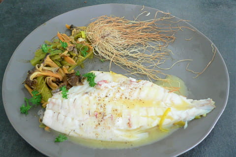 - 2 Sur une grande feuille de papier de cuisson déposez au centre un filet d'huile d'olive,dessus la moitié de la garniture de légumes ,saupoudrez d'une pincée de thym,posez le filet de pageot saupoudré d'épices pour poissons ,posez une feuille de laurier , un filet d'huile d'olive ,refermez bien hermétiquement la papillote.Faites de même pour la deuxième papillote.Faites cuire à four 180°pendant 15 minutes .