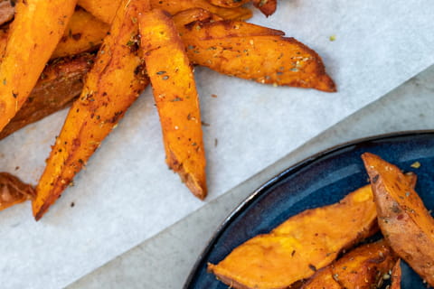 Cette recette de frites de patate douce est réalisée par par le chef Juan Arbelaez. Elle est extraite de son livre " Cuisinez, Partagez " paru aux éditions Marabout. Crédit photo : Benedetta Chiala.