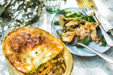 - 5 Étaler la première pâte feuilletée, elle doit tapisser les bords de votre plat. Diviser la fondue de poireaux en trois parts égales et le saumon en deux parts. Alterner les couches de fondue de poireaux (dessous, milieu, dessus) et de saumon mariné.