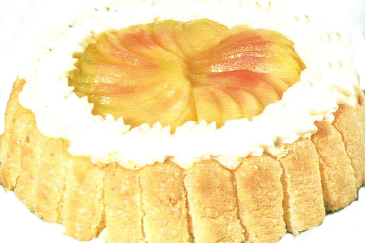 - 3 Tremper les biscuits à la cuillère dans le sirop des pêches puis les disposer autour du moule. Ajouter quelques cuillères de la préparation au fond du moule, puis des dés de pêches, remettre de la préparation, des dés de pêches, recouvrir par des biscuits à la cuillère.