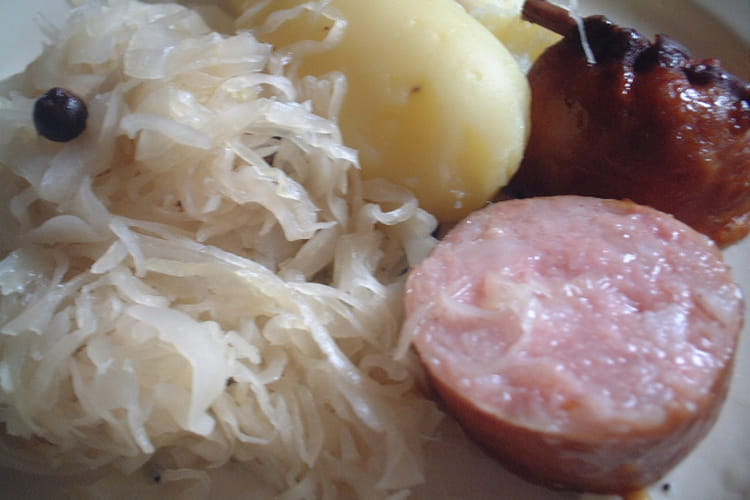 Pour finirDétaillez la saucisse en grosses tranches, entourez avec les pommes de terre et la choucroute et servez chaud. Nappez selon votre goût avec la sauce moutarde.