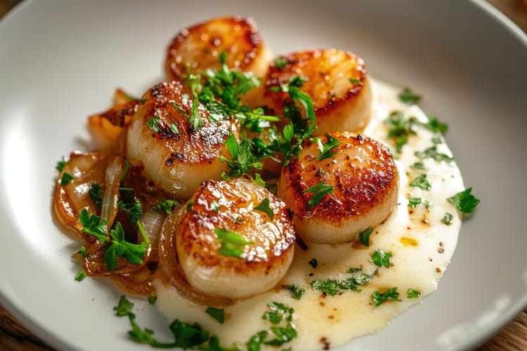 DressageNapper l'assiette de crème à l'échalote, disposer les noix de Saint-Jacques, décorer avec de la ciboulette et du persil.