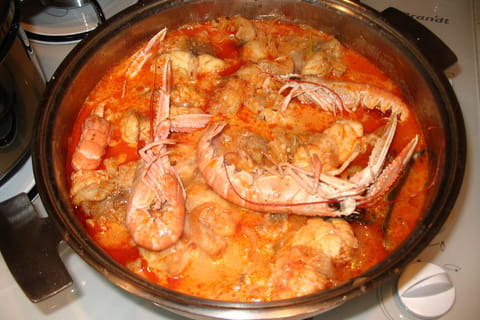 Préparation des lottesFaire d'abord revenir dans la matière grasse les morceaux de lotte et les langoustines. Retirer et remplacer par les oignons et l'ail hachés puis ajouter la tomate et remettre le poisson seul. Arroser de cognac et flamber. Verser le vin blanc.
