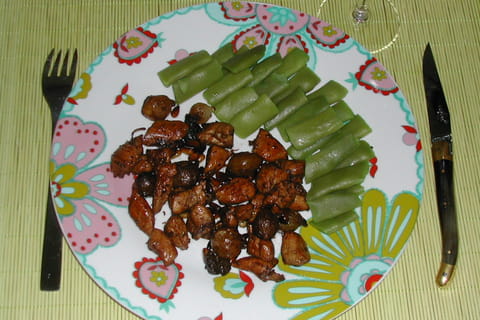 - 3 Ajouter le poulet coupé en petits morceaux puis laisser cuire à feu moyen approximativement 10 minutes en remuant de temps en temps. Ajouter un peu de vinaigre balsamique en fin de cuisson puis mélanger.