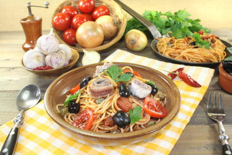 Faire cuire les pâtes dans une grande quantité d'eau bouillante salée. Pendant la cuisson, faire chauffer l'huile et ajouter l'ail, les câpres, la concassée de tomates et les anchois. Laisser cuire à feu doux 15 minutes. Verser les pâtes dans un grand saladier, ajouter la sauce, le persil, les olives et servir.