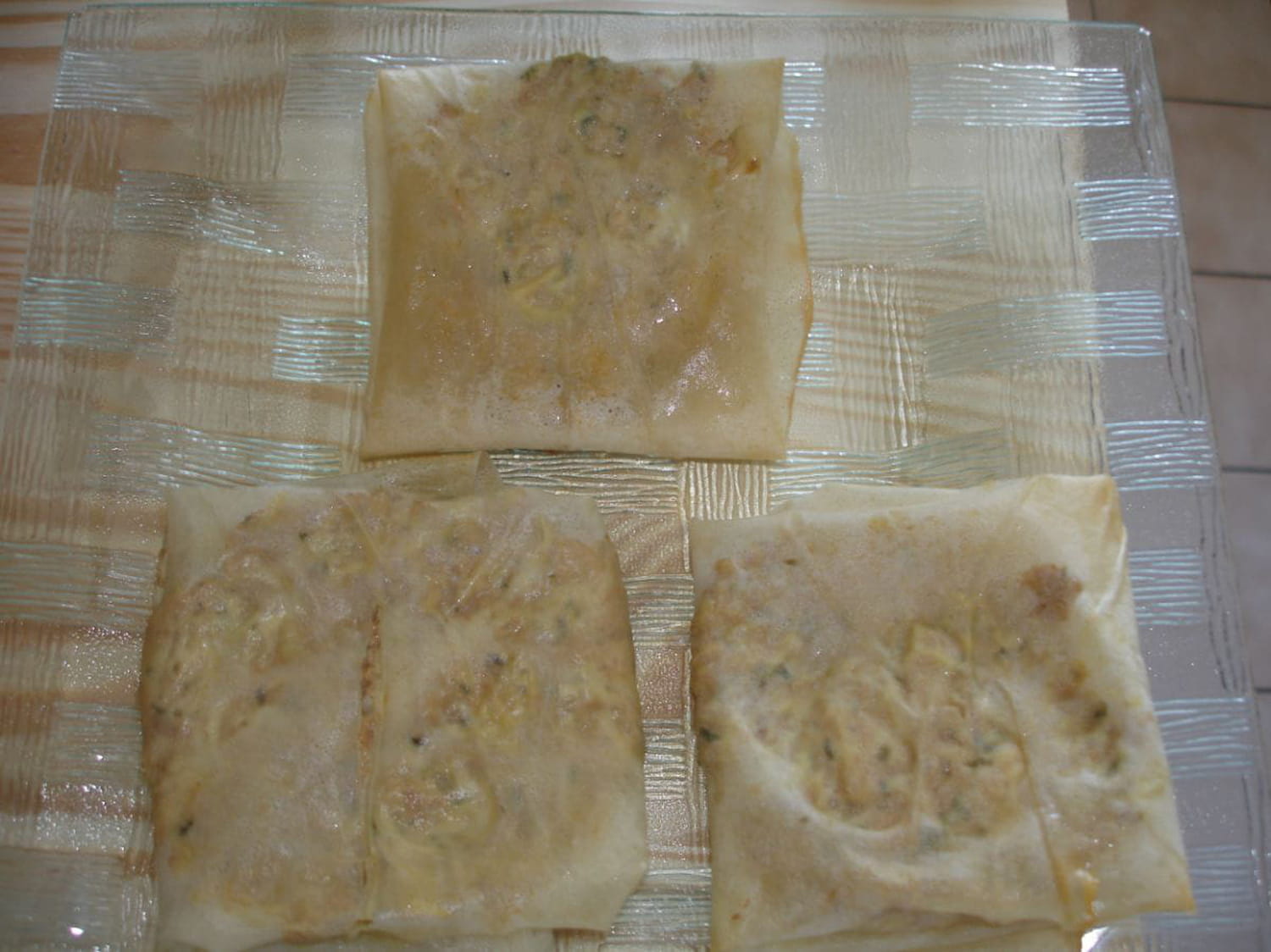 - 3 Remplir le milieu de la préparation (partager la préparation en 6 parts). Rabattre le haut et le bas de la feuille. Puis rabattre les côtés, de façon à avoir un carré. Badigeonner d'huile le dessus du carré.