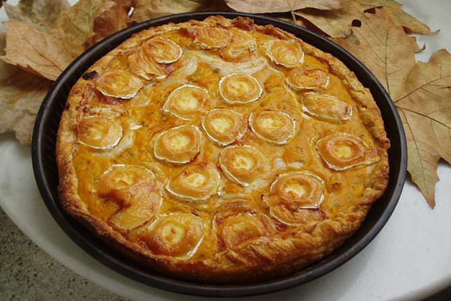 - 4 Verser la préparation sur la pâte. Couper en rondelles la bûche de chèvre, puis les répartir sur la tarte.