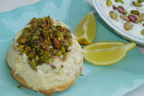 Préparer la sauce en mélangeant les yaourts, le sel, le poivre, l'échalote pelée et émincée puis les herbes, bien mélanger le tout. Verser dans une jatte et parsemer le dessus des pistaches. Servir les terrines démoulées sur assiette accompagnées de la sauce et de quartiers de citron.