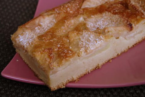 - 2 Dans un saladier, mélanger le lait de coco, les oeufs, la farine, le sucre, le sel, la levure, la cannelle. Verser le tout dans un moule, ajouter les pommes et parsemer les éclats de coco et les pépites de caramel.