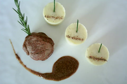 Dresser dans les assiettes les mignons de porc encore piqués du romarin, ajouter la purée le tout accompagné d'un cordon de sauce.