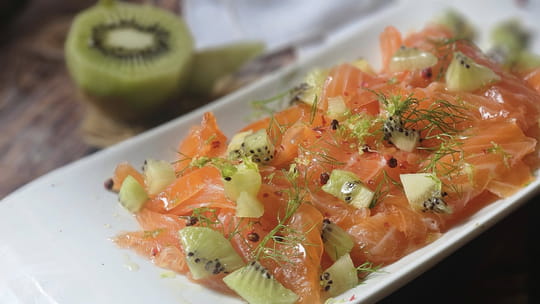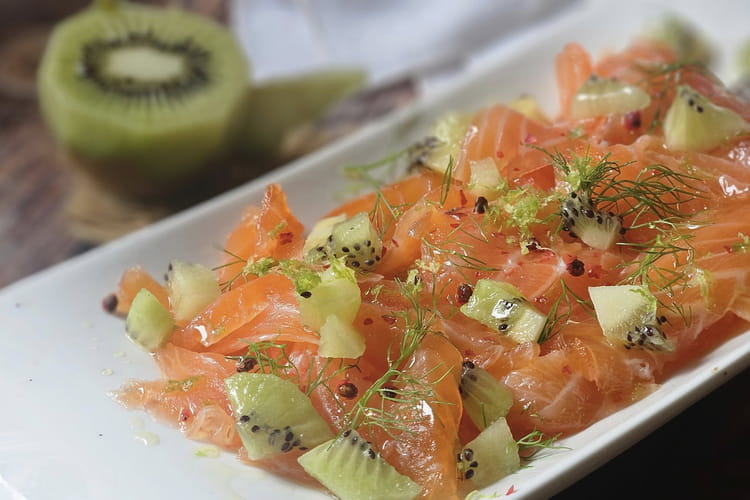 PréparationRincez rapidement le saumon sous un filet d’eau froide, puis épongez-le. Coupez le kiwi en petits dés. Tranchez finement le saumon en carpaccio, disposez sur une assiette.