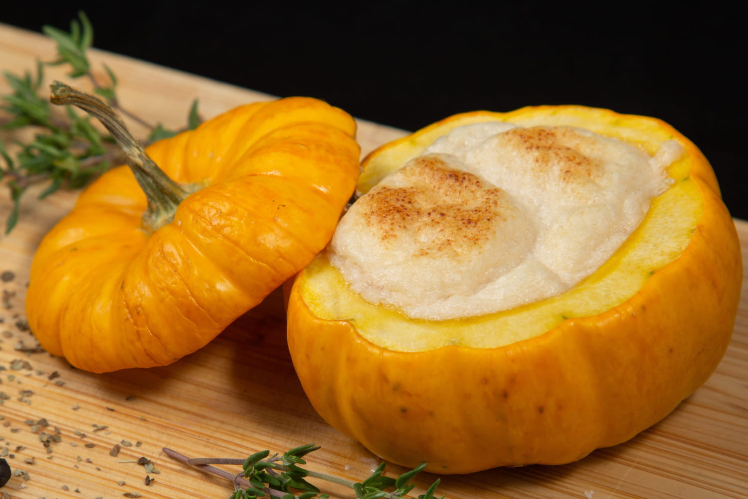 Un plat automnal où le potiron fondant se marie à une farce crémeuse au fromage, relevée par le parfum subtil du thym. Idéal pour un repas gourmand et visuellement joli à servir.