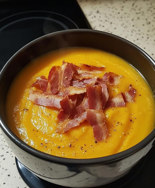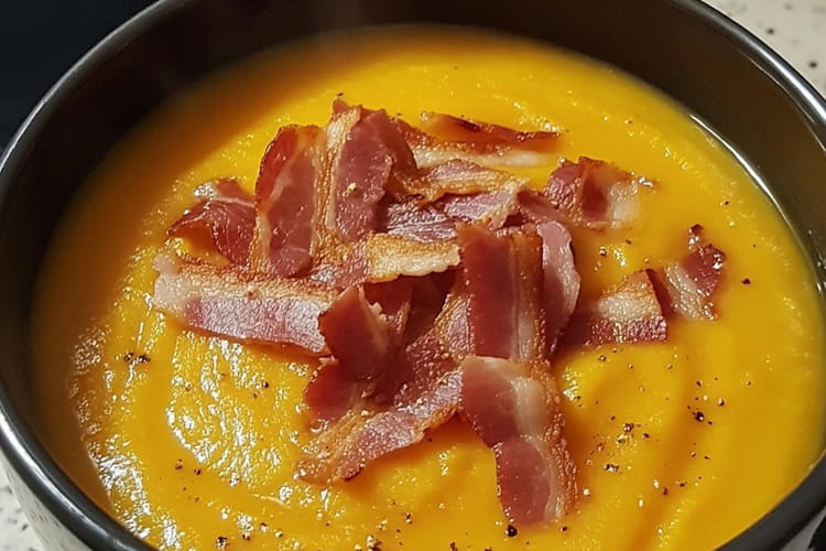 Soupe courge et lardons fumés, un bol chaud et réconfortant pour un souper complet.