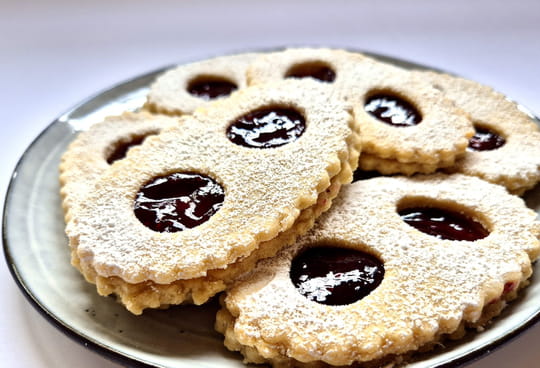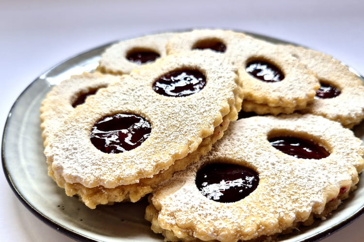AssemblageÀ travers une passoire, saupoudrez les biscuits troués de sucre glace. Étalez sur les biscuits pleins une cuillerée à café de confiture. Recouvrez-les avec les biscuits “lunettes” saupoudrés de sucre glace. Entreposez dans une boîte en fer bien fermée.