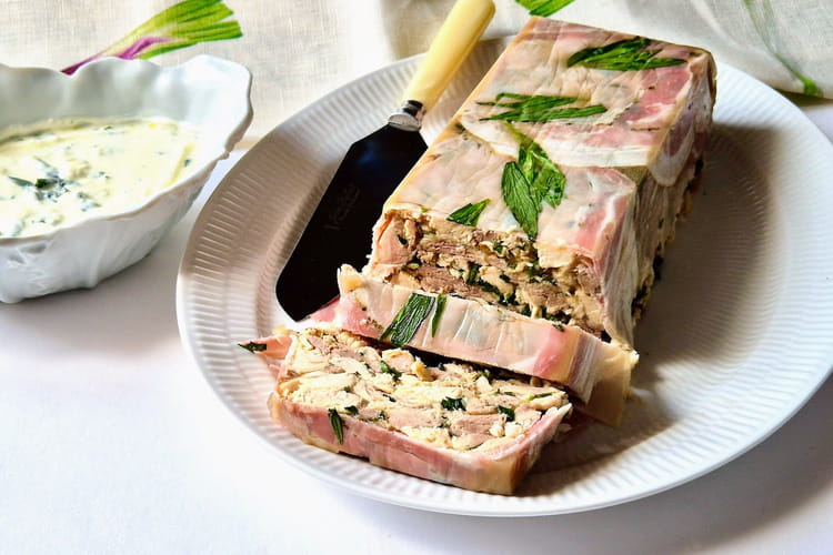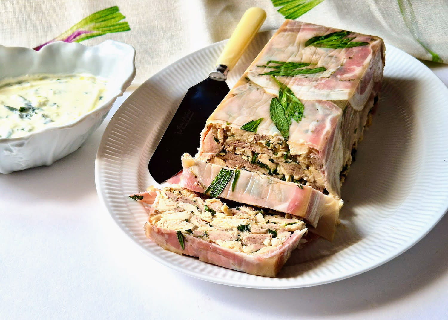 Montage de la terrineChemisez un moule à cake avec du papier cuisson et tapissez-le avec les tranches de jambon blanc aux herbes (idéalement du rostello italien ou la porchetta, comme ici). Remplissez le moule avec la viande à l'estragon, versez le jus de cuisson par-dessus et tassez bien. Recouvrez d'un film et placez au réfrigérateur.