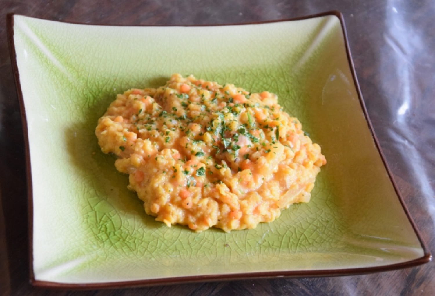 Cocotte de lentilles corail au curry, lait de coco et saumon fumé (IG bas)