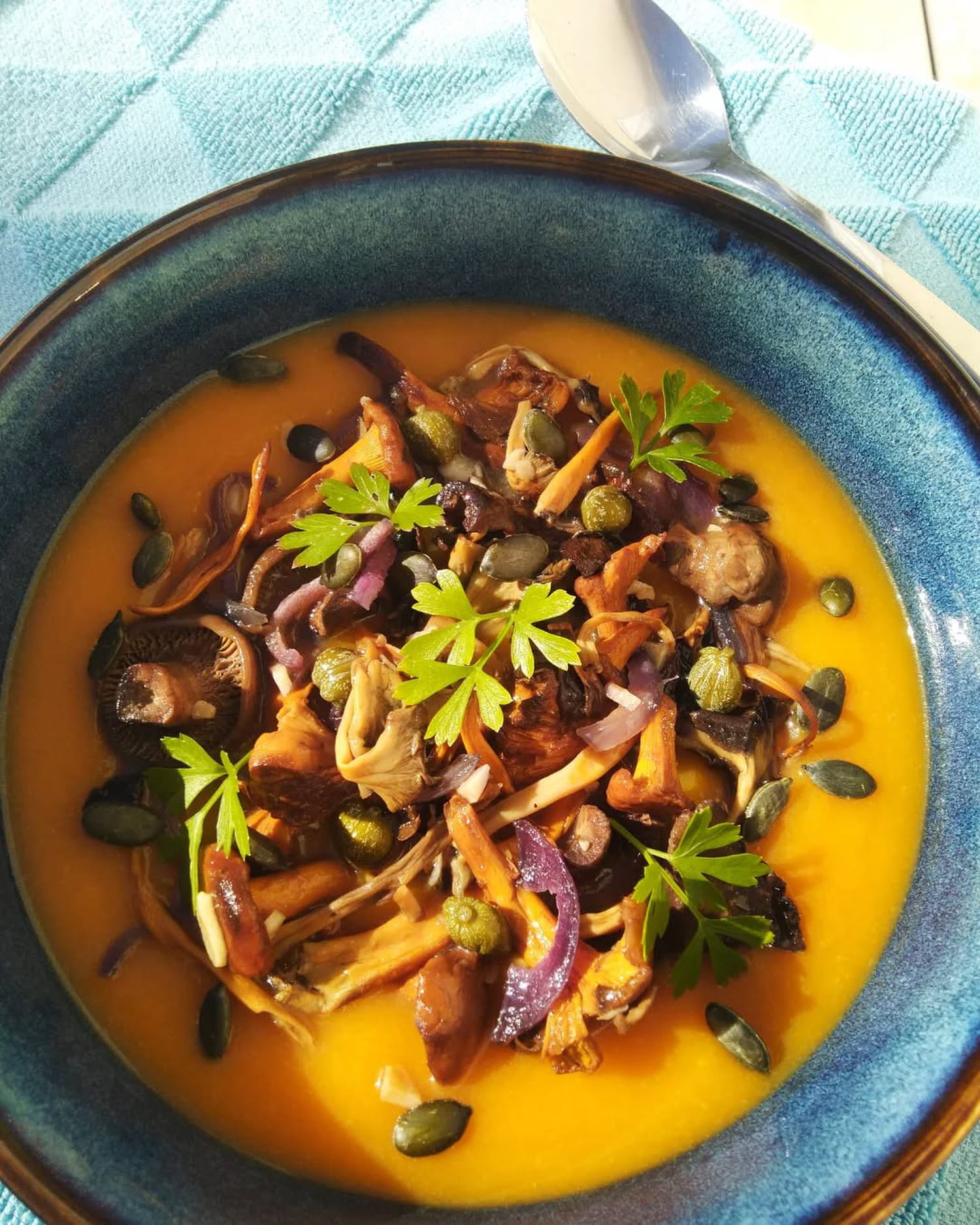 Un velouté crémeux de butternut accompagné de champignons rôtis, relevé de câpres et de graines de courge, parfait pour une entrée réconfortante.