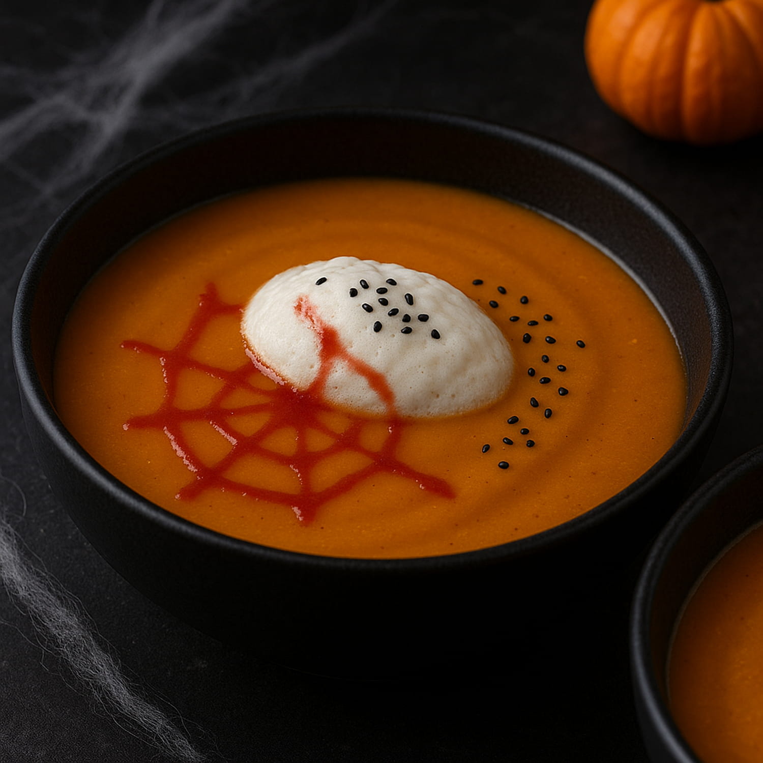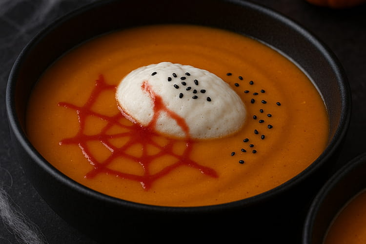 Variante dessertAjoutez 1 c. à soupe de miel et une pincée de cannelle dans le velouté, servez-le tiède avec la mousse froide : effet “crème dessert tropicale d’Halloween”. (mais bien veiller à ajuster sel/poivre dans ce cas-là).