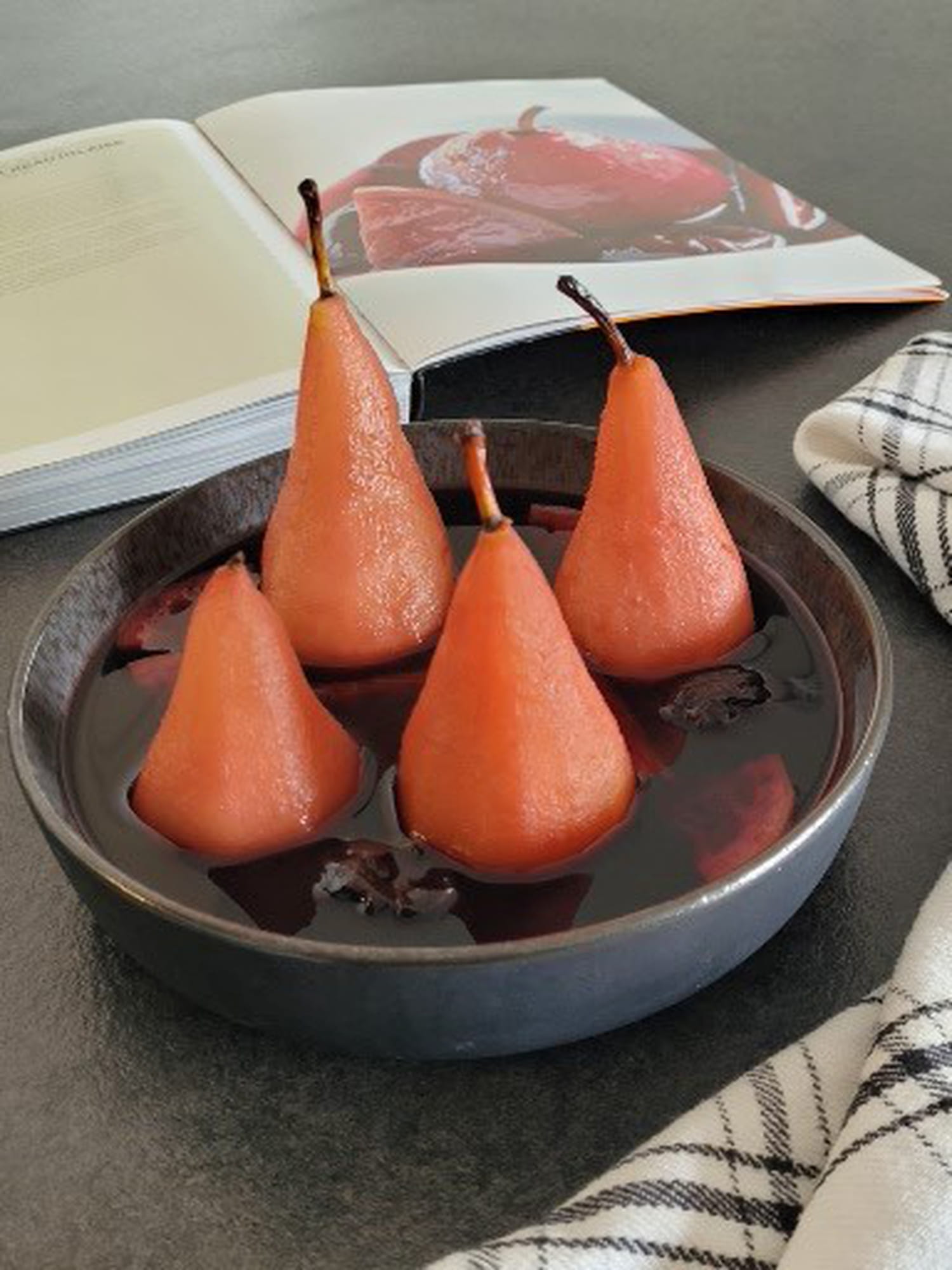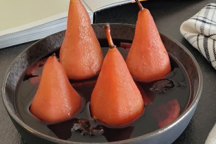 Voici ma recette de poires à la beaujolaise, elles sont vraiment délicieuses avec leur sirop qui ressemble à du vin chaud.
