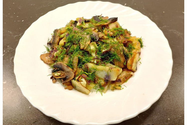 Préparer les ingrédientsNettoyer les champignons et les trancher. Éplucher les pommes de terre. Les couper en 2, puis les trancher finement. Éplucher et hacher l'oignon et l'ail. Ciseler l'aneth.