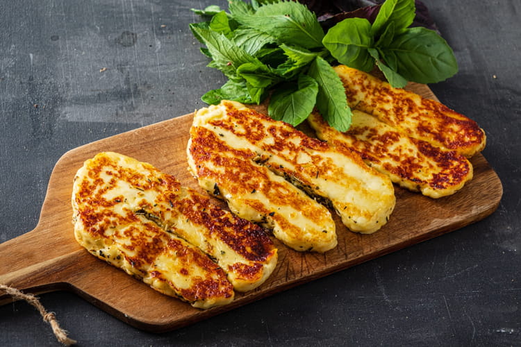 - 1 Couper le halloumi en tranches d’environ 1 cm d’épaisseur.