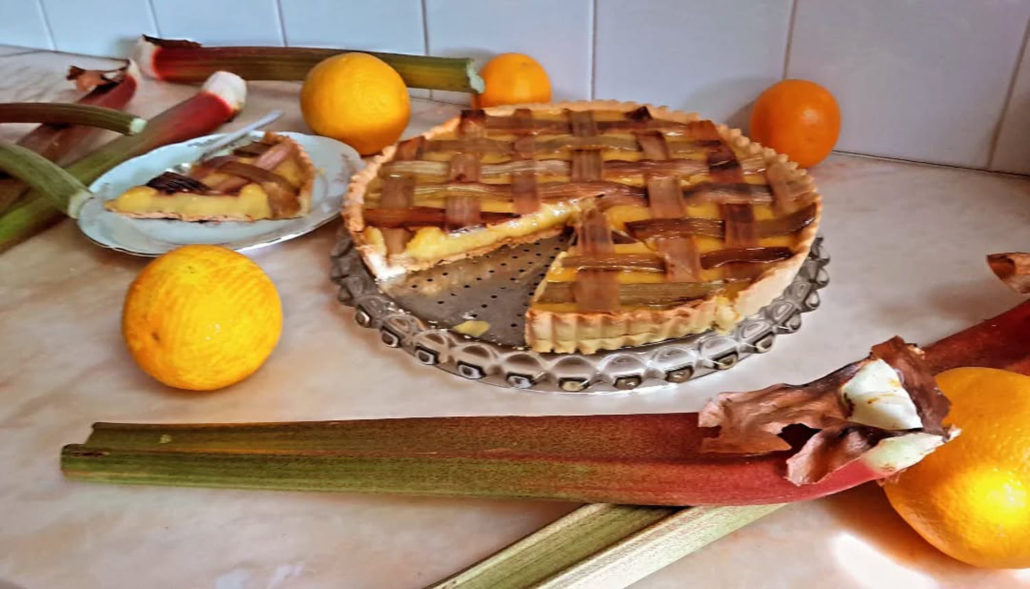 Par ces temps pluvieux, j'avais envie de réaliser une tarte réconfortante, il me restait de la rhubarbe du jardin que j'avais congelée. J'ai innové en ajoutant une orange.
